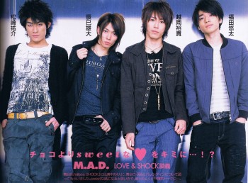 但是由於這團體勢力實在過於龐大,幾乎沒有全員出動一起的工作。而基本上哪些成員做哪些團體的伴舞或舞台大概都是固定的。本篇要寫的M.A.D.是以舞台劇演出為主的四人松崎祐介、越岡裕貴、福田悠太、辰巳雄大。